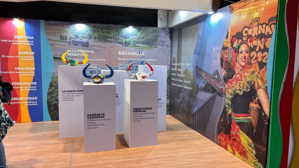 El estand del Carnaval de Barranquilla propone un recorrido que se inicia con el Museo del Carnaval como puerta de entrada cultural en la que se vive la fiesta todo el año, luego desde una gran pantalla que proyecta a la ciudad y a su Carnaval como Patrimonio Cultural de la Humanidad y culmina con la presentación de un portafolio de experiencias diseñadas para agencias y operadores turísticos.