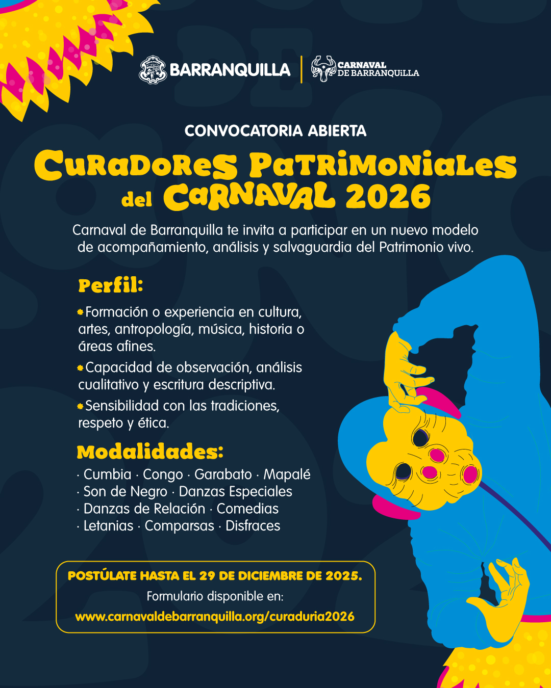 Los interesados podrán postularse hasta el 29 de diciembre de 2025, diligenciando el formulario disponible en: www.carnavaldebarranquilla.org/curaduria2026