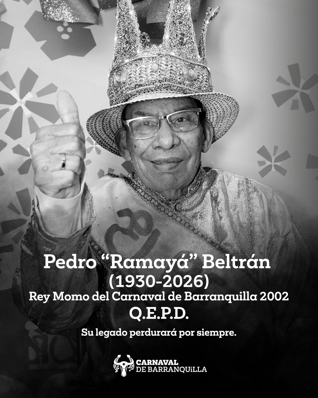 Barranquilla, abril de 2026. Carnaval de Barranquilla lamenta profundamente el fallecimiento del maestro Pedro “Ramayá” Beltrán, rey Momo del Carnaval de Barranquilla en el año 2002, una de las figuras más representativas de la fiesta y uno de los músicos folclóricos más importantes de la región y el país.